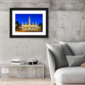This canvas wall art features the Rathaus, Vienna's grand city hall, showcasing its historic architecture and an elegant clock tower. Illuminated beautifully at night, the piece captures a stunning palette of blue, yellow, and gold, inviting a sense of charm and sophistication to any space.