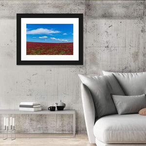 A wide view of a field of red clover beneath a blue sky dotted with white clouds. Dense red flowers and green foliage give the scene a vibrant, serene, natural mood that reads summery and peaceful. Works well in home living spaces and nature-inspired rooms.