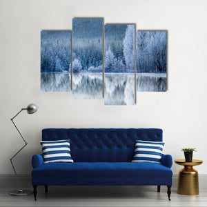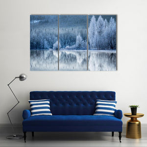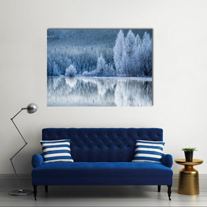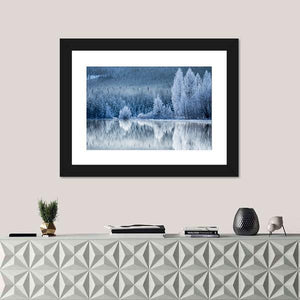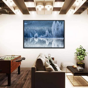 This canvas features a serene winter landscape with frozen trees reflected in calm water. The misty background and cool color palette evoke a tranquil atmosphere, making it an ideal piece for modern decor.