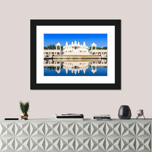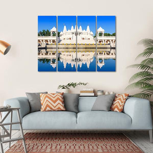This canvas art depicts an ornate Hindu temple reflecting on calm water under a clear blue sky. Its serene and peaceful atmosphere makes it an ideal addition to your wall decor.
