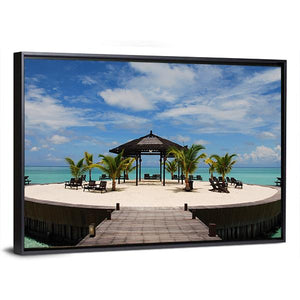 A wide-angle, eye-level view of a tropical island with a wooden pier and gazebo, palm trees, lounge chairs and clear turquoise water beneath a sky with clouds. The cool blues, greens and tans give a serene, vacation-like mood. Works well in modern or coastal-inspired rooms.
