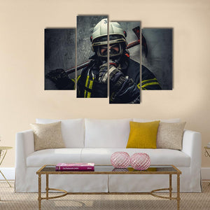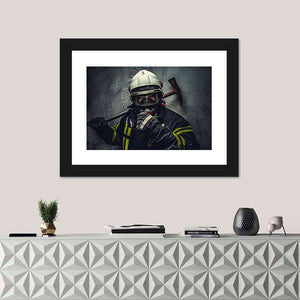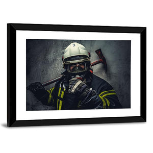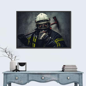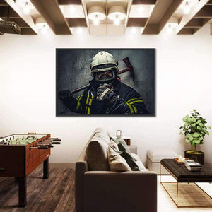 A centered, eye-level portrait of a firefighter—helmet and gas mask, fire axe held over the shoulder, number '3' visible—that conveys a heroic, serious, determined mood. Rendered in a photorealistic, dramatic style with black, yellow, white, red, and gray tones. Suited to modern home room decor or spaces that favor bold professional imagery.