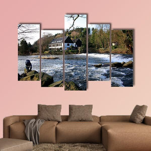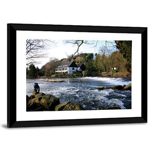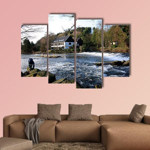 River Wupper in North Rhine, Germany depicted with a riverside house, flowing water, rocky shore and a person standing on the rocks. A blue, green, white and brown palette and rule-of-thirds composition create a serene, natural, calm mood with a rustic feel. This canvas print suits rustic or nature-inspired spaces and provides a quiet focal point on the wall.