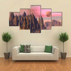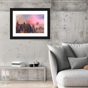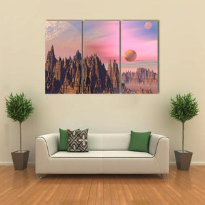 Rocky Mountains And Planets depicts an alien planet landscape with layered rock formations and two textured moons in a pink, purple, orange, brown, and tan palette. The digital fantasy composition uses depth and the rule of thirds to create a serene, otherworldly sense of scale. It suits modern home decor and room wall art.