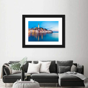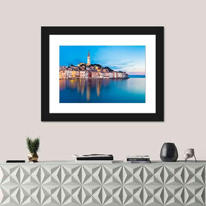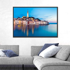 This canvas art beautifully captures the coastal town of Rovinj, showcasing its charming harbor, church tower, and waterfront buildings. The serene mix of blue, orange, and white creates a vibrant scene, especially with the reflection of building lights on calm water, making it a perfect addition to any space seeking a peaceful atmosphere.