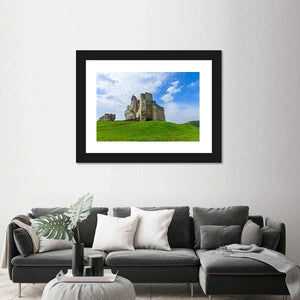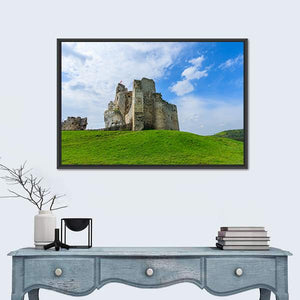 This realistic landscape captures stone castle ruins on a green grassy slope beneath a blue sky with clouds. The scene feels historic and serene, a calm wall art choice for living rooms, hallways, or a study.