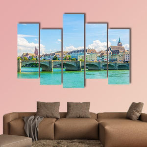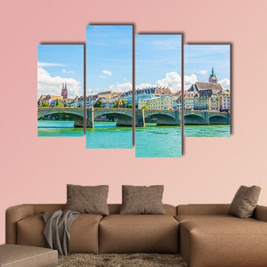 Saint Martin Church in Basel, Switzerland is shown in a realistic, eye-level cityscape featuring the river, a stone-arched bridge, and historic buildings with tiled roofs beneath puffy white clouds. The peaceful, sunny scene uses blue, green, white and beige tones for a scenic riverside mood. This canvas artwork pairs well with room decor that favors modern wall art or scenic prints.