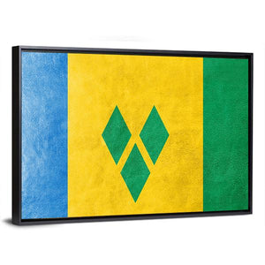 This canvas features the Saint Vincent and the Grenadines flag rendered in a symmetrical, modern composition with bold, patriotic color. The blue, yellow and green palette and four green diamonds create a graphic focal point suited to house and room decor in modern interiors.