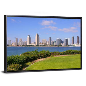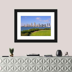 San Diego’s skyline meets ocean and grassland in a realistic cityscape that feels serene, bright and vibrant. The blue, green, white and grey palette with a rule-of-thirds composition highlights tall buildings and lush greenery, well-suited for modern living rooms or offices.