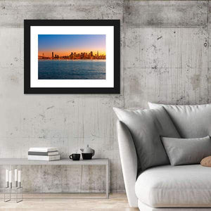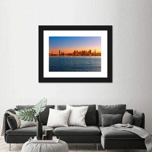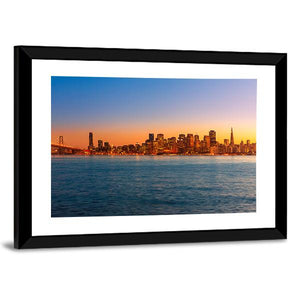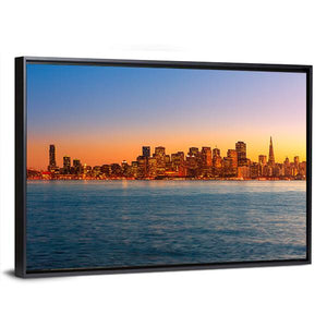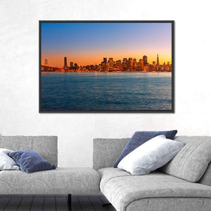 This photographic, realistic canvas captures the San Francisco skyline at sunset, with tall buildings glowing and calm ocean water below. Blue, orange, yellow and grey tones create a peaceful, serene urban atmosphere that pairs well with modern or urban room decor.