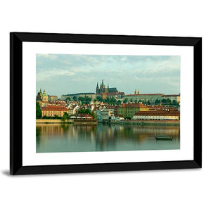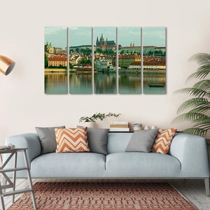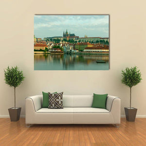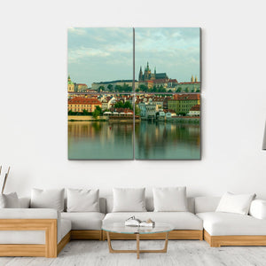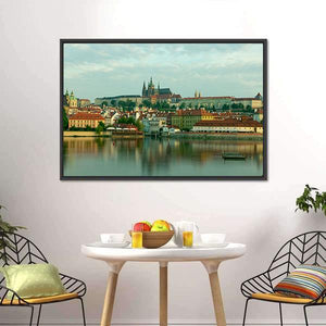 This canvas art captures a serene scene along the Vltava River, showcasing a harmonious blend of historical buildings, a majestic castle, and gentle boats floating on the water. The calming palette of blues and greens invites a peaceful atmosphere, making it a beautiful addition to your space.
