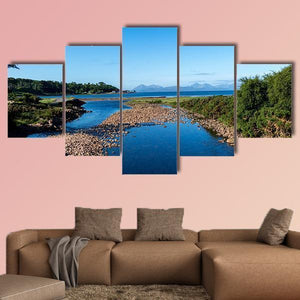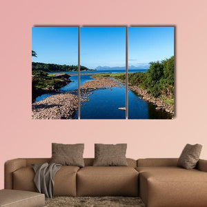 A realistic landscape of a Scottish lake with sunlit water, a rocky riverbed, and distant mountains. The calm, natural palette of blues, greens, browns, and soft grays gives the scene a serene, restful feel. Suited to modern, nature-inspired rooms and simple wall decor.