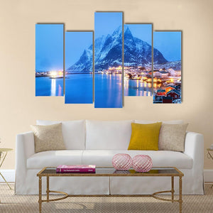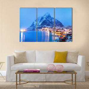 A realistic landscape showing a sea bay in the Lofoten Islands with a snow-covered mountain, an illuminated village, and calm water reflections. Cool blues with touches of yellow and red create a serene, cold yet vibrant winter-night mood that suits modern home decor.