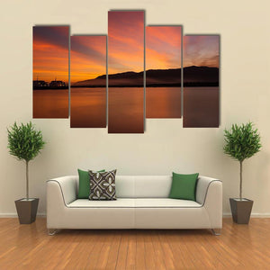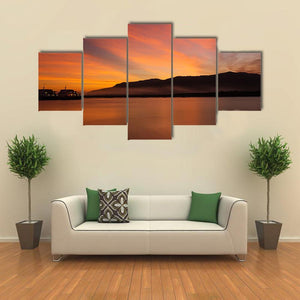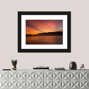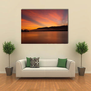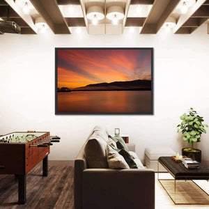 Sea Coast At Sunset Canvas Wall Art shows a calm, dramatic sunset over water with misty mountains and a small boat. Warm orange and purple tones and streaking clouds build depth and a serene twilight mood. This modern seascape fits well in contemporary home decor as a quiet focal piece.