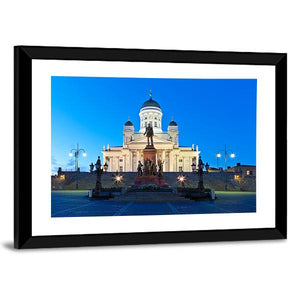 This photorealistic canvas wall art captures the majestic beauty of the Senate Square with the Lutheran Cathedral in Finland. The serene blue and white palette showcases the impressive dome, statues, and streetlights, creating a grand atmosphere ideal for any décor.