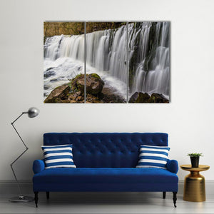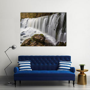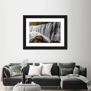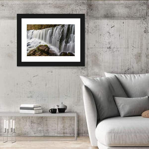 This landscape artwork captures a serene waterfall, surrounded by lush rocks and trees. The peaceful palette of greens, whites, and browns brings a natural touch to your space.