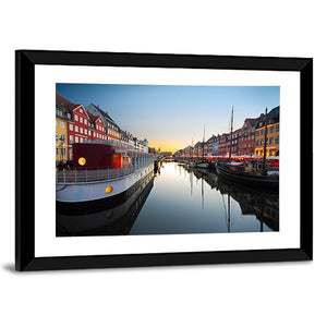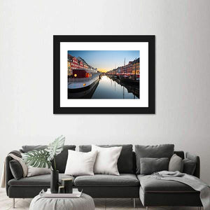 This canvas art captures the serene beauty of Copenhagen's Nyhavn at twilight, featuring charming buildings, tranquil boats, and vibrant reflections in the water. The warm colors evoke a welcoming atmosphere, perfect for any room.