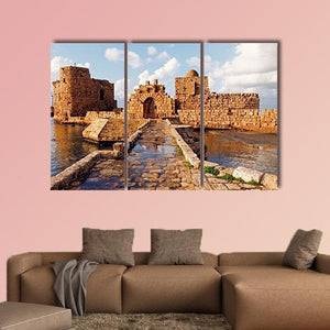 Sidon Sea Castle in Lebanon shows a stone bridge leading to a fortress with an arched entrance, stone walls and towers beside calm water under a blue sky with white clouds. Rendered in a photorealistic style with a brown, blue, white and grey palette, it carries a historic, serene, majestic mood and fits travel-themed or modern room decor.