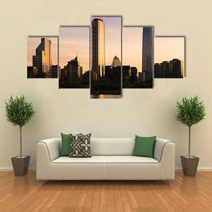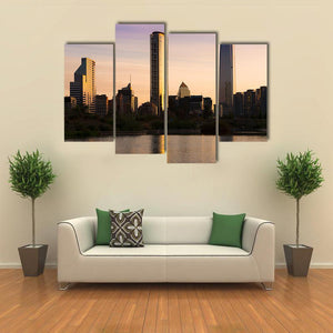 This canvas art features a serene cityscape of tall skyscrapers reflecting on a tranquil lake at sunset. The calming blues, purples, and golds in the artwork create an inviting atmosphere, perfect for modern decor.