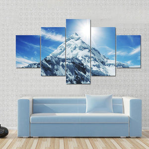 Experience the majestic allure of a snowy mountain peak bathed in sunlight. This striking landscape captures the serene beauty of nature, with dramatic elements like wispy clouds and craggy ice formations. It complements modern decor beautifully.