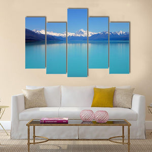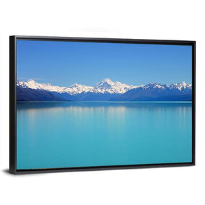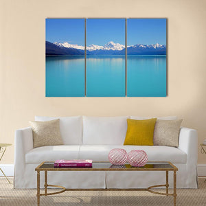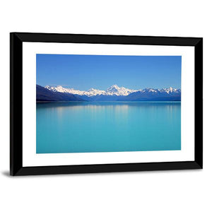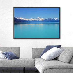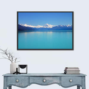 A landscape photograph of snow-capped mountains mirrored in a calm lake, with clear reflections and a blue-aqua palette. The scene feels serene and majestic, bringing a tranquil, nature-inspired touch to modern or nature-focused rooms.