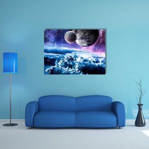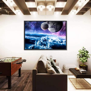 Explore the cosmos with this captivating canvas featuring planets, a vibrant nebula, and dramatic clouds. The blend of blue, purple, and white creates a dreamy atmosphere perfect for any modern décor.