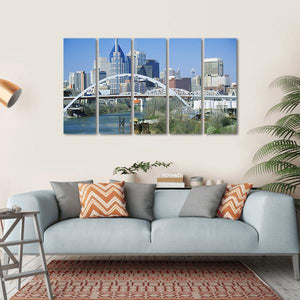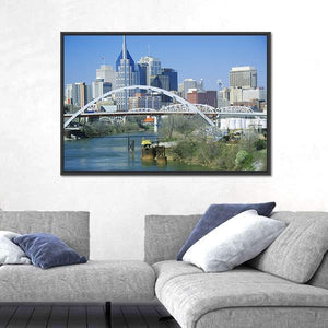 This modern canvas art features a vibrant city skyline, showcasing distinctive architecture and an arched bridge over a river. The bright palette of blue, white, and green evokes an expansive, urban feel, making it a striking addition to any space.