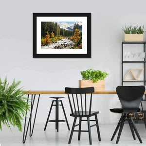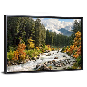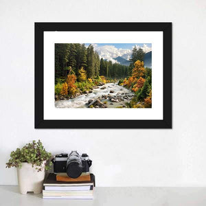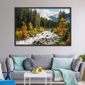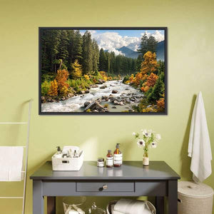 The Stream & Forest Canvas Wall Art beautifully captures a serene landscape featuring a tranquil river, lush forests, and majestic mountains. The rich palette of greens, browns, and oranges embodies the essence of autumn, making it a perfect addition to any nature lover's decor.