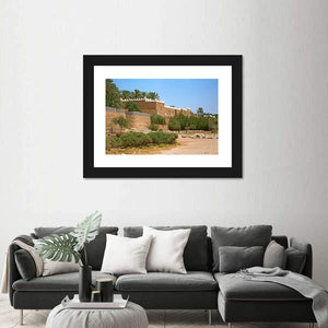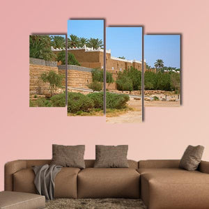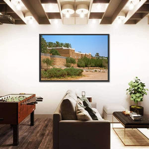 A realistic landscape of the old city streets in Diriyah near Riyadh, showing mud-brick buildings, a rough stone base, scattered palm trees and a clear summer sky. Sunlit tans, greens and blues give a sunny, serene, historic mood that suits warm, earthy interiors or travel-themed rooms.