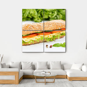 This canvas art features a close-up of a delicious sub sandwich, showcasing vibrant ingredients like lettuce, tomato, cucumber, and cheese. Its appetizing and fresh vibe makes it a simple yet striking addition to any kitchen or dining area.
