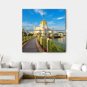 This canvas captures the serene beauty of the Sultan Omar Ali Saifuddin Mosque in Brunei, featuring its ornate golden dome and curving walkway. The peaceful scene, bathed in shades of blue, white, gold, and green, evokes a bright and tranquil atmosphere that's perfect for enhancing any room's decor.