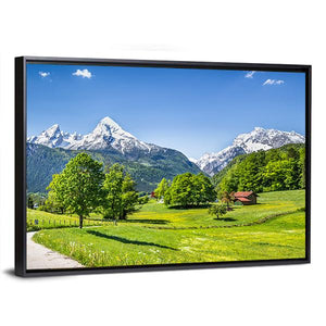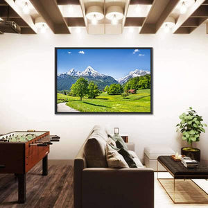 A wide, realistic view of the Alps shows snow-capped mountains, green meadows, a winding dirt path, and a small red barn tucked among trees. The scene feels peaceful and idyllic, with a blue-green and white palette that suits modern interiors and room decor.