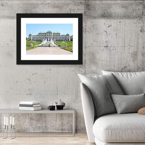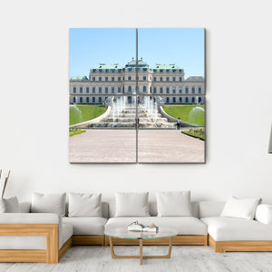 This canvas art features the grand Belvedere Castle in Vienna, surrounded by manicured gardens and a tiered fountain. Experience a serene atmosphere with its realistic depiction of classical architecture in harmonious colors of green, blue, and white.