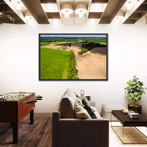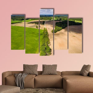 An aerial view of summer farmland showing lush green fields beside freshly tilled brown earth, a tree-lined road, and soft cloud shadows. Diagonal lines in the composition give a serene, expansive, natural feeling, suitable as modern nature wall art for living rooms or studies.