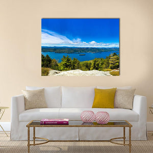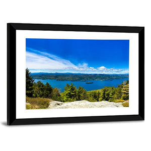 This canvas wall art beautifully captures the serene landscape of Buck Mountain in Lake George, showcasing a peaceful lake surrounded by majestic mountains and lush forests under a wide sky. The soft palette of blues and greens instills a sense of calm, making it an inviting addition to any nature lover's decor.