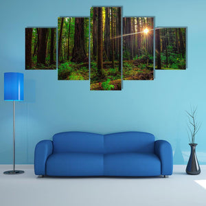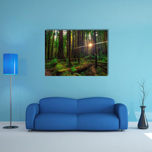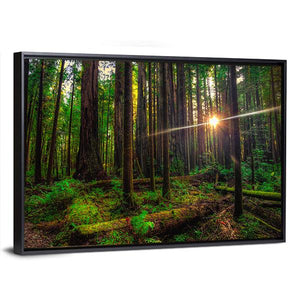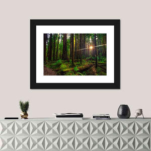 Sunlight In The Redwoods shows a photorealistic forest scene with fallen trees, moss on trunks and sunlit greenery. The image feels serene, natural and bright, with visible lens flare and blue sky hints. This nature print suits modern home decor as a calm, grounding wall accent.