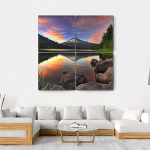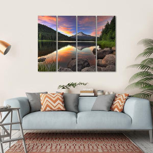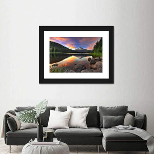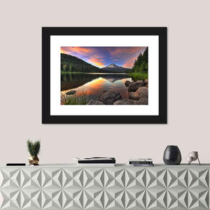 This artwork captures a serene sunset over Trillium Lake, framed by the grandeur of a snow-capped mountain and lush forests. The vibrant sky reflects beautifully on the water, creating a peaceful atmosphere for any nature lover.