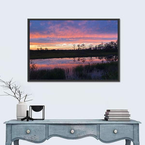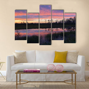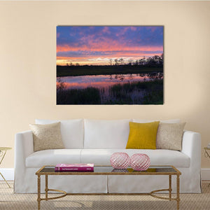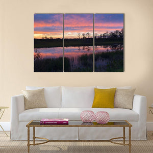 A realistic capture of an Everglades swamp at sunset, showing clouds and silhouetted trees reflected on the water. Soft pinks, purples and blues create a tranquil yet dramatic atmosphere. Suited to modern room decor, it works well on living room or bedroom walls.
