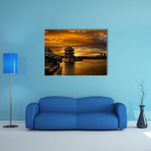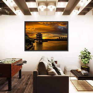 Sunset In Yixing depicts a pagoda-style temple beside a lake beneath a cloudy, golden sunset sky, with trees framing the scene. Rendered realistically in warm orange, gold and brown tones, it feels dramatic and peaceful and makes a calm focal point for modern home spaces.