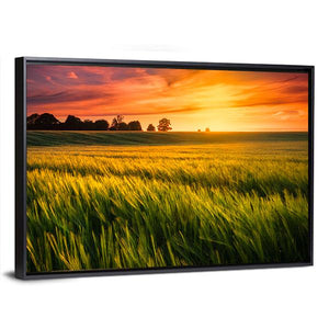 This canvas features a serene sunset over a vast wheat field, with tall grass swaying gently in the breeze. The warm palette of orange, yellow, and green evokes a peaceful atmosphere, making it a lovely addition to any nature-inspired décor.