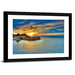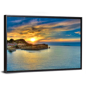 This canvas art captures a serene sunset over a coastal village in Greece, showcasing the vibrant colors of the sea and sky. It's an inviting addition to any wall, perfect for lovers of landscape art.