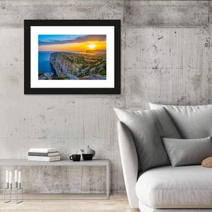 Experience the serene beauty of coastal cliffs and the ocean at sunset with this canvas wall art. The dramatic hues of blue, orange, and yellow depict layered cliffs and textured vegetation, capturing a moment that inspires awe.