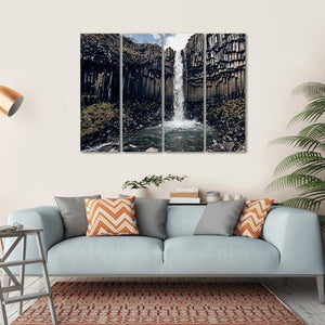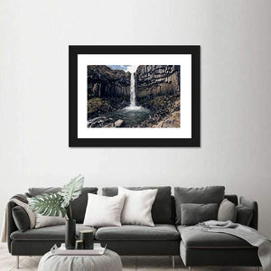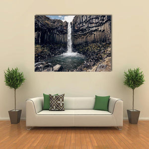 Experience the power of nature with this striking depiction of Svartifoss, a dramatic black waterfall flanked by hexagonal basalt columns. This realistic canvas art captures a breathtaking wide shot, highlighting the contrast of dark grays, blues, and whites against rugged rocks.
