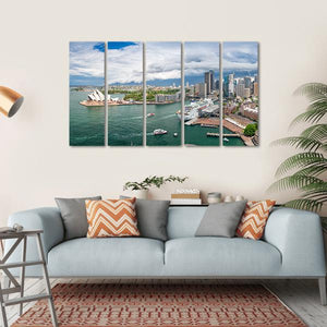 This canvas art captures a vibrant view of Sydney's iconic skyline, featuring the famous Sydney Opera House and the Harbour Bridge. The dynamic scene showcases bustling boats and dramatic cloud formations, bringing the lively atmosphere of this beloved city to your home.