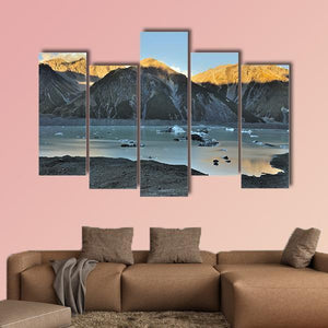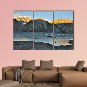A realistic landscape print of Tasman Glacier and its lake, showing sunlit mountain peaks, calm water and drifting icebergs. The serene, majestic palette of blues, grays, browns and gold creates a peaceful atmosphere that suits house and modern room decor.