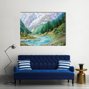 This canvas wall art captures the tranquil Teberda River nestled in the serene gorge of the Caucasus Mountains. With vibrant blues and greens, it showcases snow-capped peaks, coniferous trees, and wildflowers along the riverbank, creating a peaceful yet majestic atmosphere.