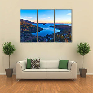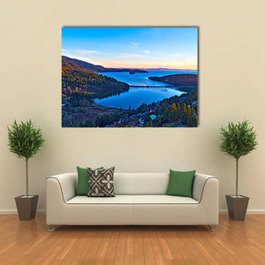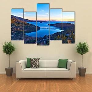 Teddy Bear Cove Bay captures an aerial view of a tranquil bay with islands, mountains, dense forest and houses at sunset. Rendered in blues, greens and warm sunset oranges and yellows, the scene feels serene and picturesque. It suits nature-inspired or modern room decor.