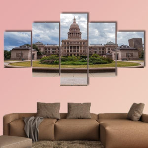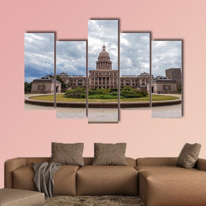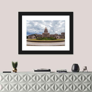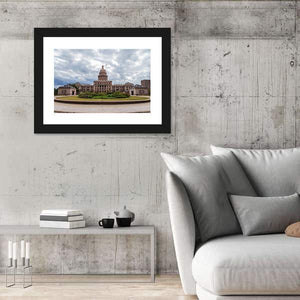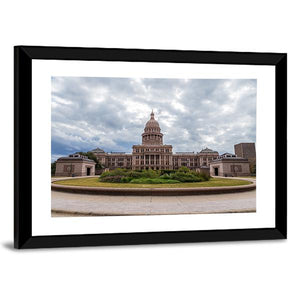 A realistic canvas print of the Texas State Capitol building, centered and symmetrical against a cloud-filled, stormy sky. Muted greys, greens, browns, and whites create a grand, stately, overcast mood that highlights the domed building and classical columns. Suits living rooms and formal spaces seeking architectural-focused wall decor.