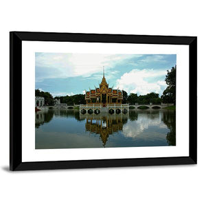 This piece depicts a traditional Thai pavilion above a calm lake, joined by a bridge and crisp cloud reflections that echo the ornate temple architecture. The symmetrical composition and gold‑blue‑green palette give it a serene, majestic feel. It works well as a calm, traditional accent in home rooms like living rooms or entryways.