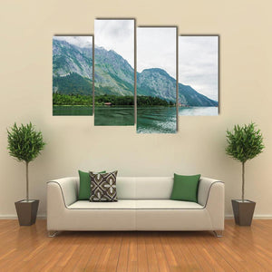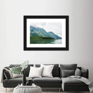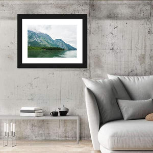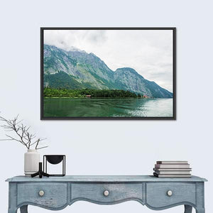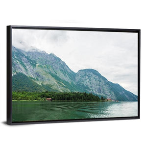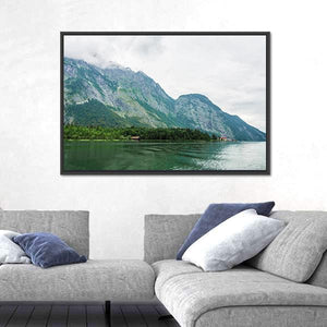 This realistic landscape print of Alpsee Lake in Bavaria shows tree-covered mountains with rocky peaks, a calm rippling lake, and small buildings tucked among the trees. Rendered in greens, blues, grays, and browns, it carries a serene, overcast mood that suits modern or nature-inspired rooms like living rooms or bedrooms.
